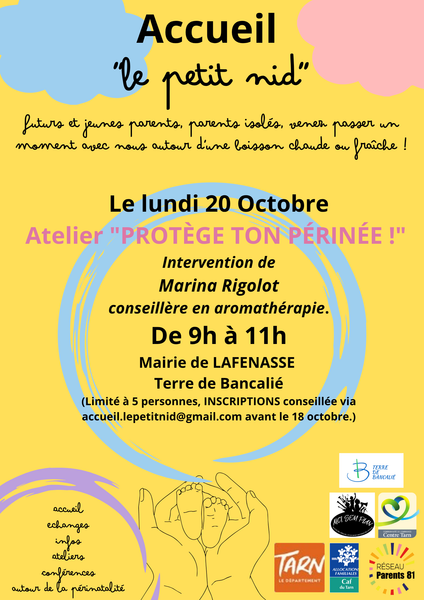 Futurs et jeunes parents, parents isolés, venez passer un moment à l'accueil "Le Petit Nid" sur la thématique de la protection du périnée avec l'intervention de Marina Rigolot, conseillère en aromathérapie.