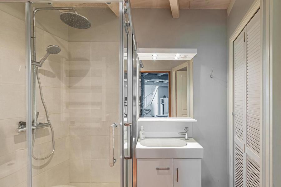 À l'étage, la mezzanine abrite une chambres avec lit 140 × 200.