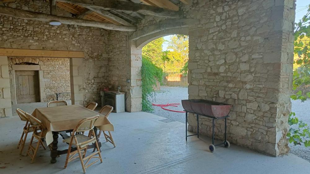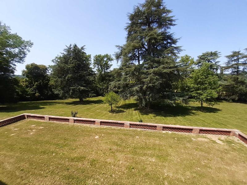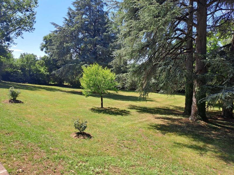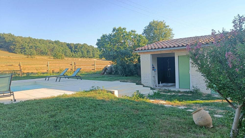 Extérieur : grand jardin, parc devant la maison (côté route), piscine privative, douche extérieure, salon de jardin, boulodrome