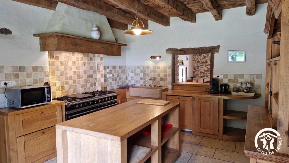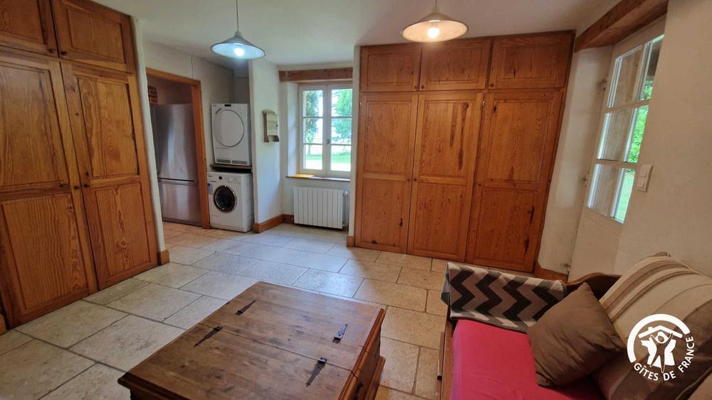 - grand séjour avec salon (cheminée et TV) et table à manger. Une cuisine toute équipée : lave-vaisselle, piano de cuisson avec four, cafetière à dosettes Senseo®, micro-ondes, réfrigérateur américain, lave-linge et sèche-linge.
