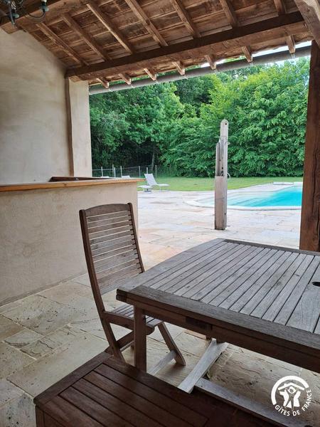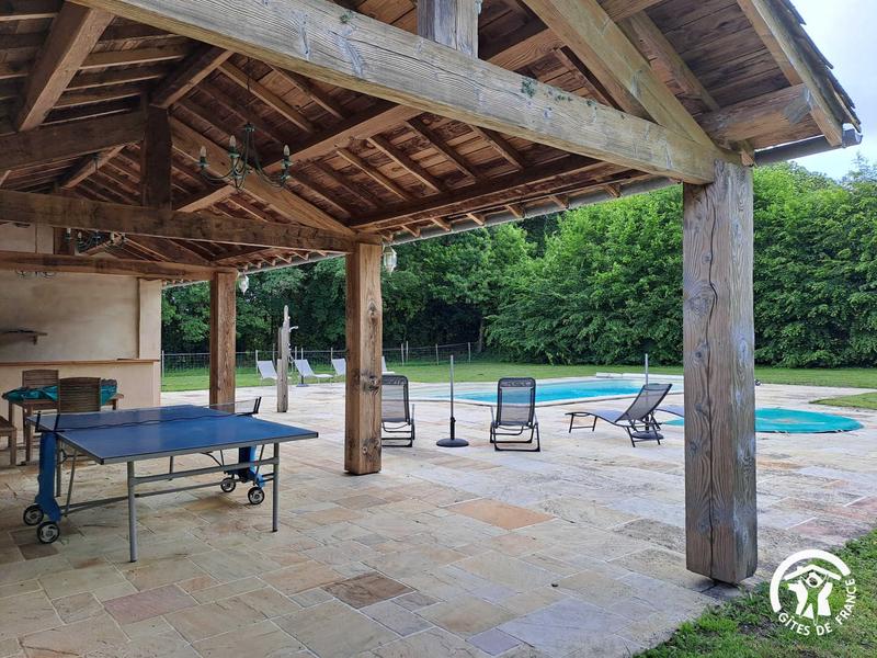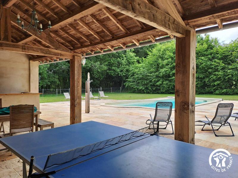 L'extérieur : plusieurs terrasses, un abri couvert, un barbecue et le portique pour les enfants, piscine ouverte de juin à septembre, 10x5m avec fond progressif. Un bâtiment abrite la table de ping-pong et table à manger d'appoint.