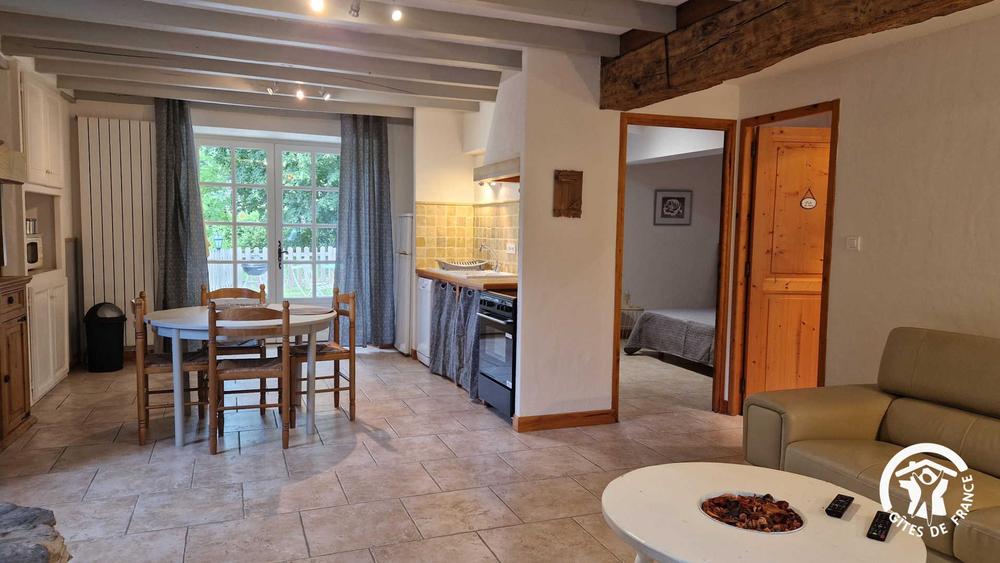 - Pièce à vivre avec cuisine ouverte, table à manger, salon avec TV et cheminée fonctionnelle. Cuisine équipée d'un four, réfrigérateur avec congélateur, petit lave-vaisselle, micro-ondes, bouilloire et cafetière à dosettes Senseo®.