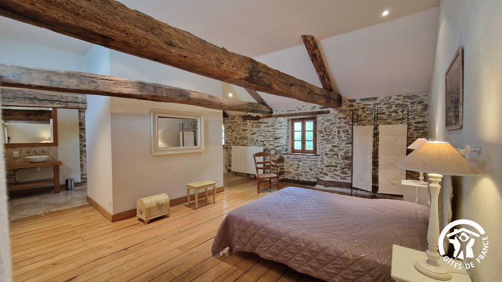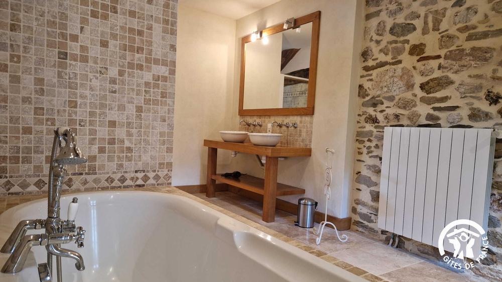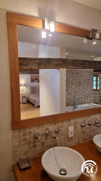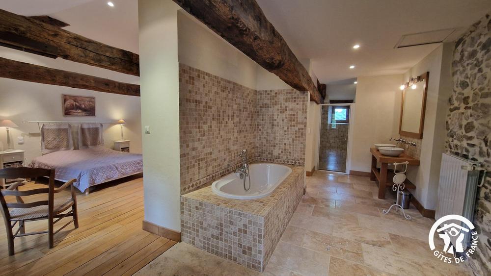 - A l'étage, une superbe chambre avec lit en 160cm et salle de bain ouverte. Une belle baignoire, une grande douche et deux vasques.