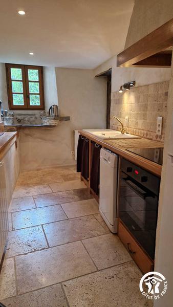 - Rez-de-chaussée : séjour avec table à manger, salon avec cheminée fonctionnelle et TV. Derrière la cheminée, la cuisine tout en long et équipée : four, réfrigérateur avec congélateur, petit lave-vaisselle, micro-ondes, bouilloire et cafetière à dosettes Senseo®. Buanderie (lave-linge, sèche-linge), wc.